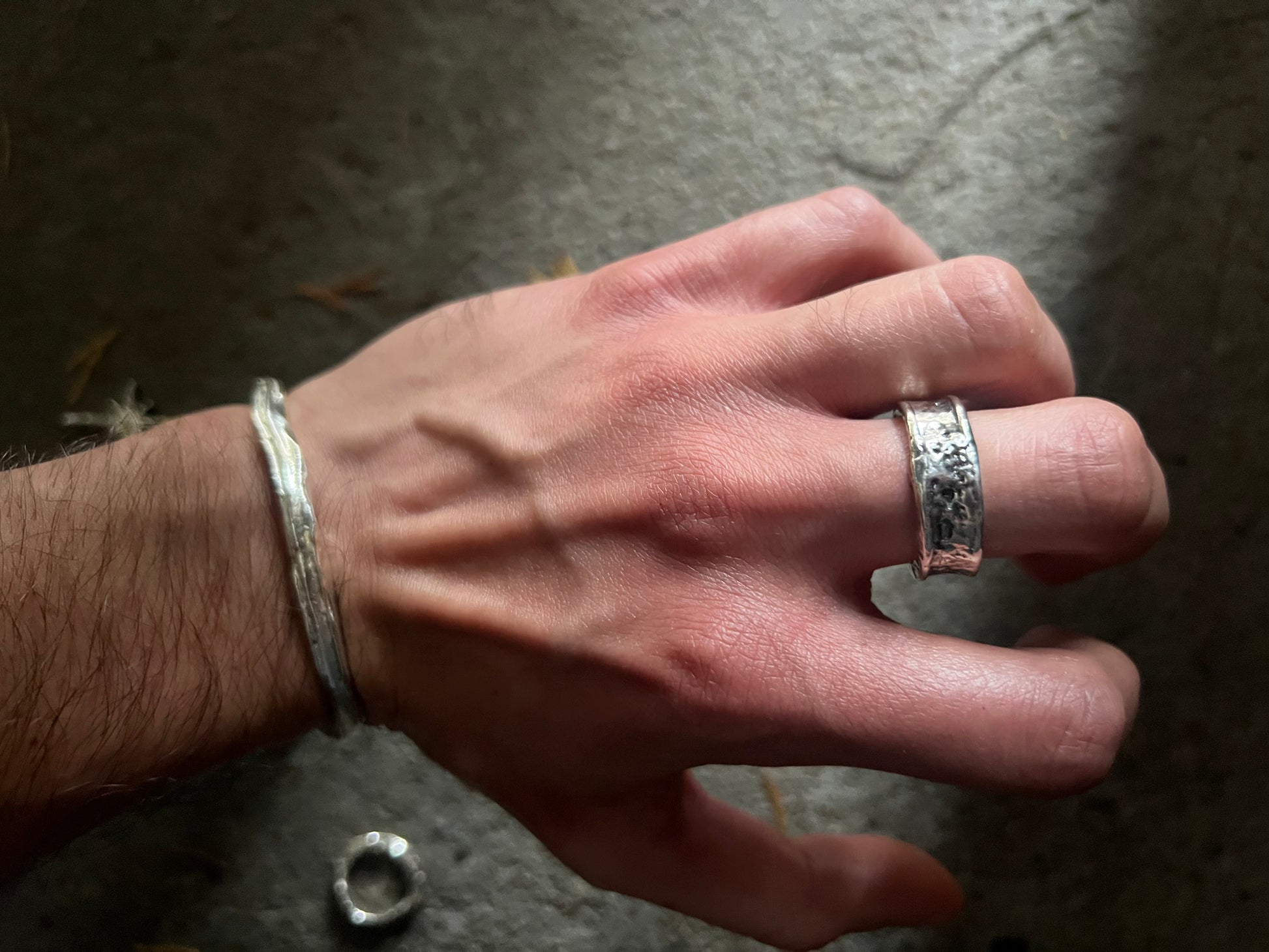 The Centenario ring was the second ring I created, resembling the Vanguardia from afar, yet they’re distinctly different. This model is narrower, which also makes it thicker and more subtle. Here, I aimed for a more delicate texture while still maintaining the organic feel I sought.