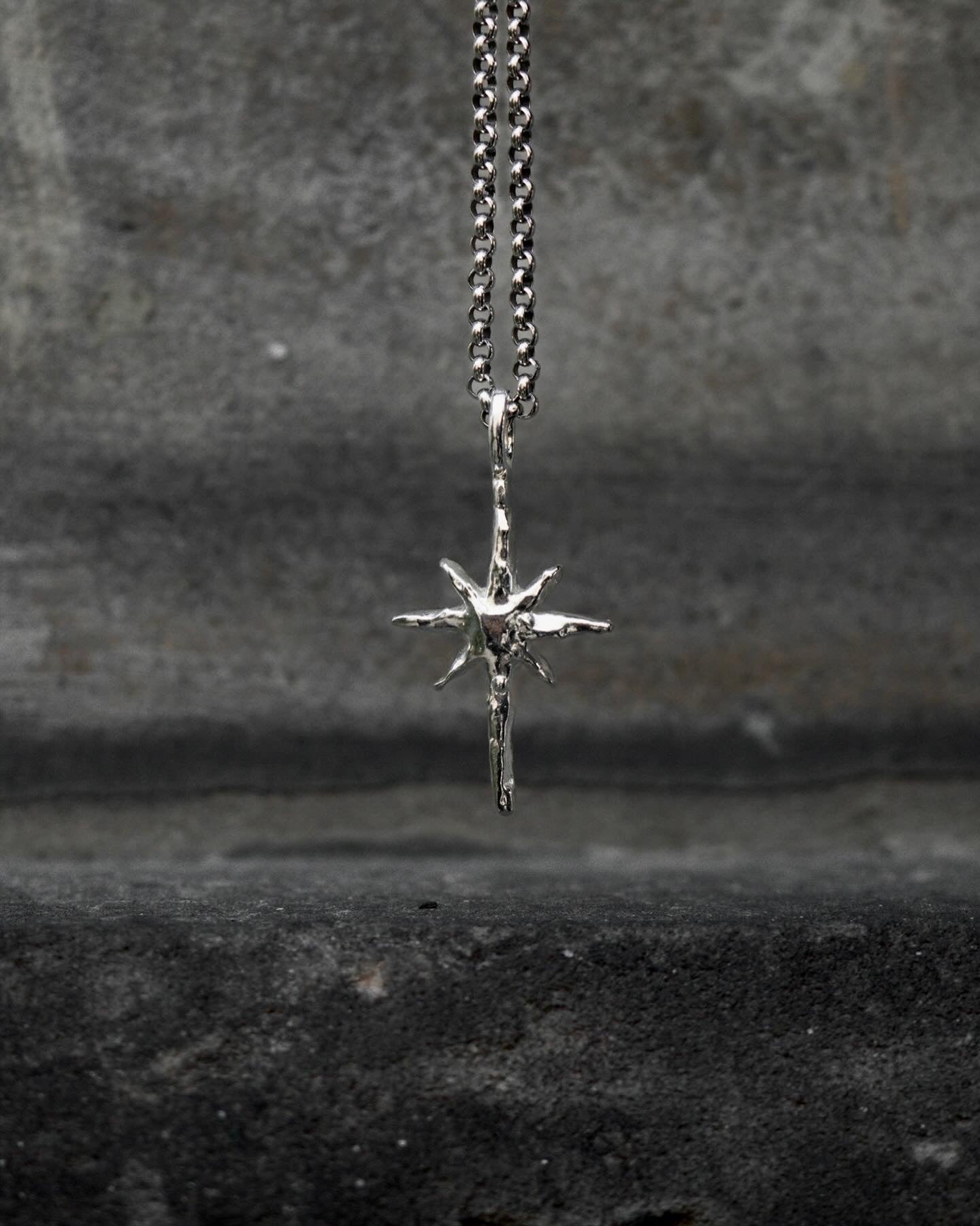 The North Star II is a solid, classic pendant with an uneven texture. It's a robust piece, designed with a firm concept in mind. The non-oxidized version is also available — just leave a note at the time of purchase or send a message via Instagram.