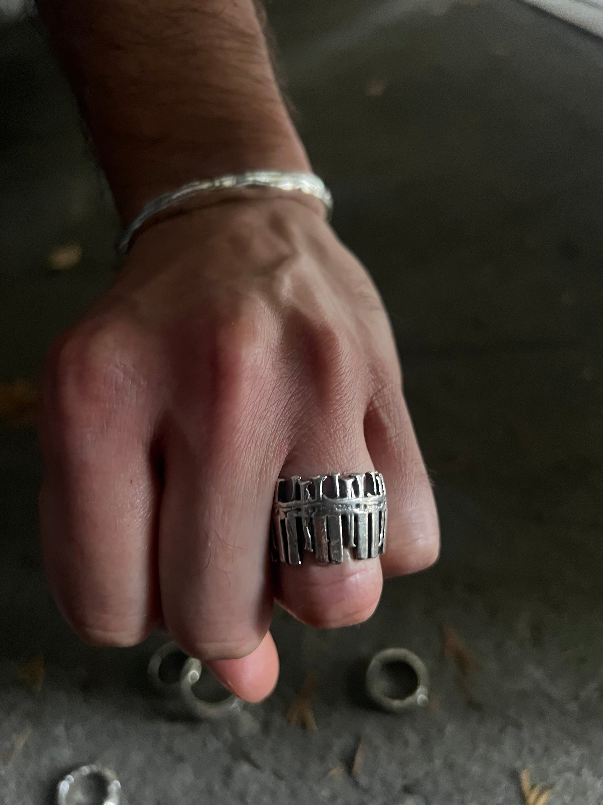 The Colta Ring is inspired by the sharp form of Roman nails and the cracked surface of old bark. Made from .925 silver and finished with an oxidized patina to highlight every shadow and scar.